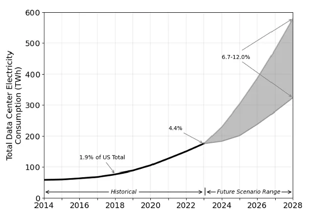 The rise of artificial intelligence is reshaping not just software and hardware; it’s shaking the very foundation of America’s energy grid. The average query typed into ChatGPT requires about 10 times as much electricity as a Google Search. This is according to Goldman Sachs who in a recent report cited that they expect overall electricity demand to rise approximately 2.4% from 2022 to 2030. AI workloads are extraordinarily power-hungry, and the data centers needed to support them are being built at a staggering pace. According to a recent report by the U.S. Department of Energy and the Lawrence Berkeley National Laboratory, data centers could consume up to 12% of all U.S. electricity by 2028, up from roughly 3-4% in 2022. That would mark a fourfold increase in just six years – a growth curve that rivals the early internet era but with exponentially higher power demands.